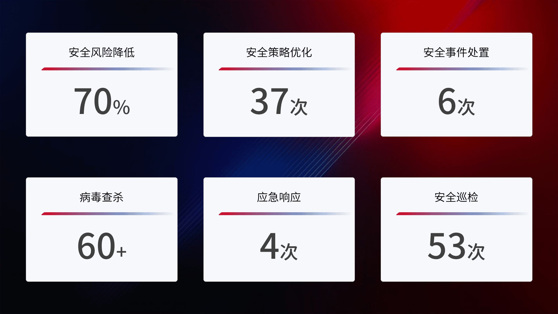 提供全面的安全事件报告体系,,,,包括处置报告、、、、周报、、、季度和年度总结,,,结合持续监控,,,帮助客户深入了解网络安全状况。。。