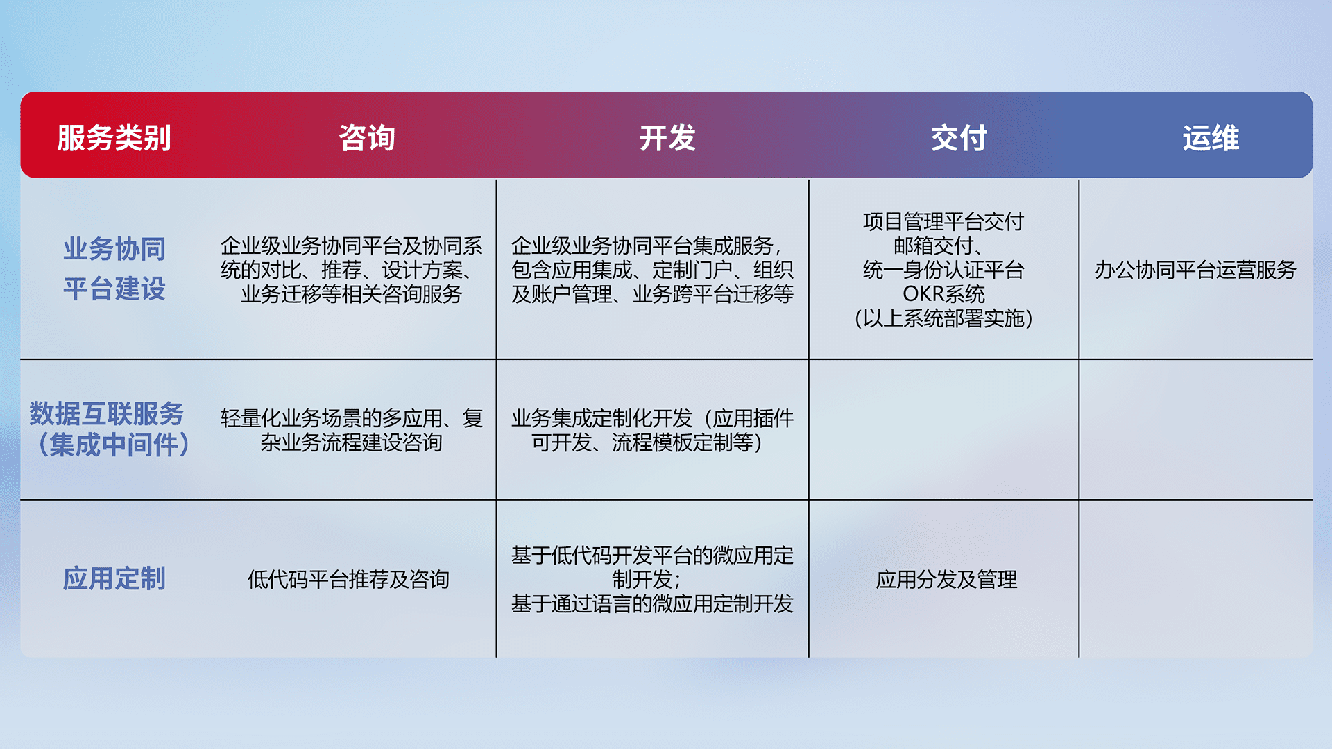 针对钉钉、、企微、、、IDaas等平台级产品提供产品的规划、、、、方案、、、交付、、、定制化开发等服务,,,,实现如统一协同办公、、、智能客户服务、、、混合会议管理、、、智能数据查询、、、等业务场景,,实现数字化转型。。。