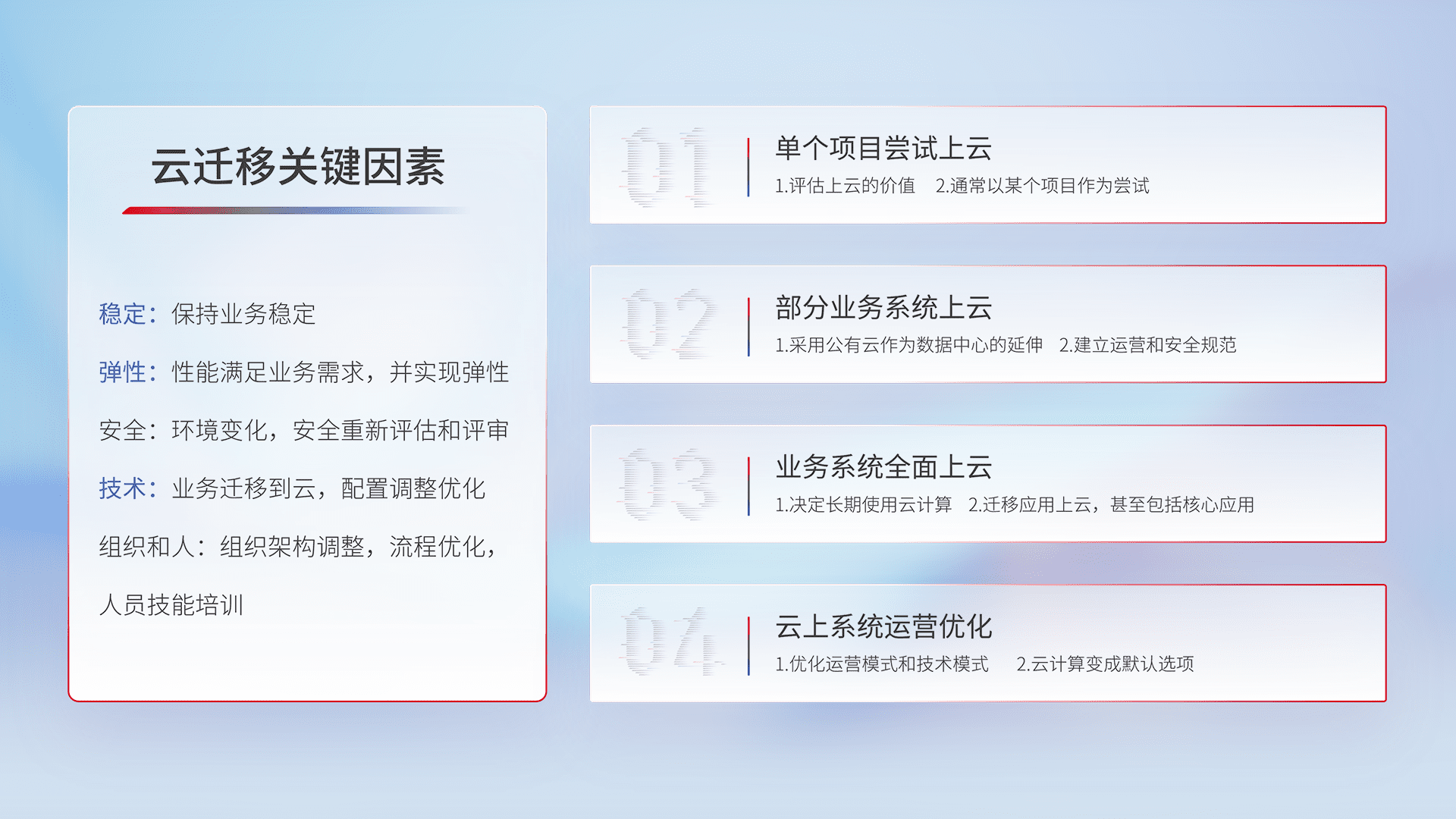 结合实际业务,,从规划设计、、、云平台选型、、云原生改造、、、、数据迁移、、集成交付,,,迁移全过程为客户识别最佳上云路径,,做好风险识别管理,,,,设计网络架构、、身份权限、、、安全审计合规、、、操作审计、、、、日志审计、、监控告警策略、、、多站点容灾设计等,,对云上基础设施进行整体规划,,提升IT治理水平,,以满足弹性、、、高可用、、、、高性能的需求。。