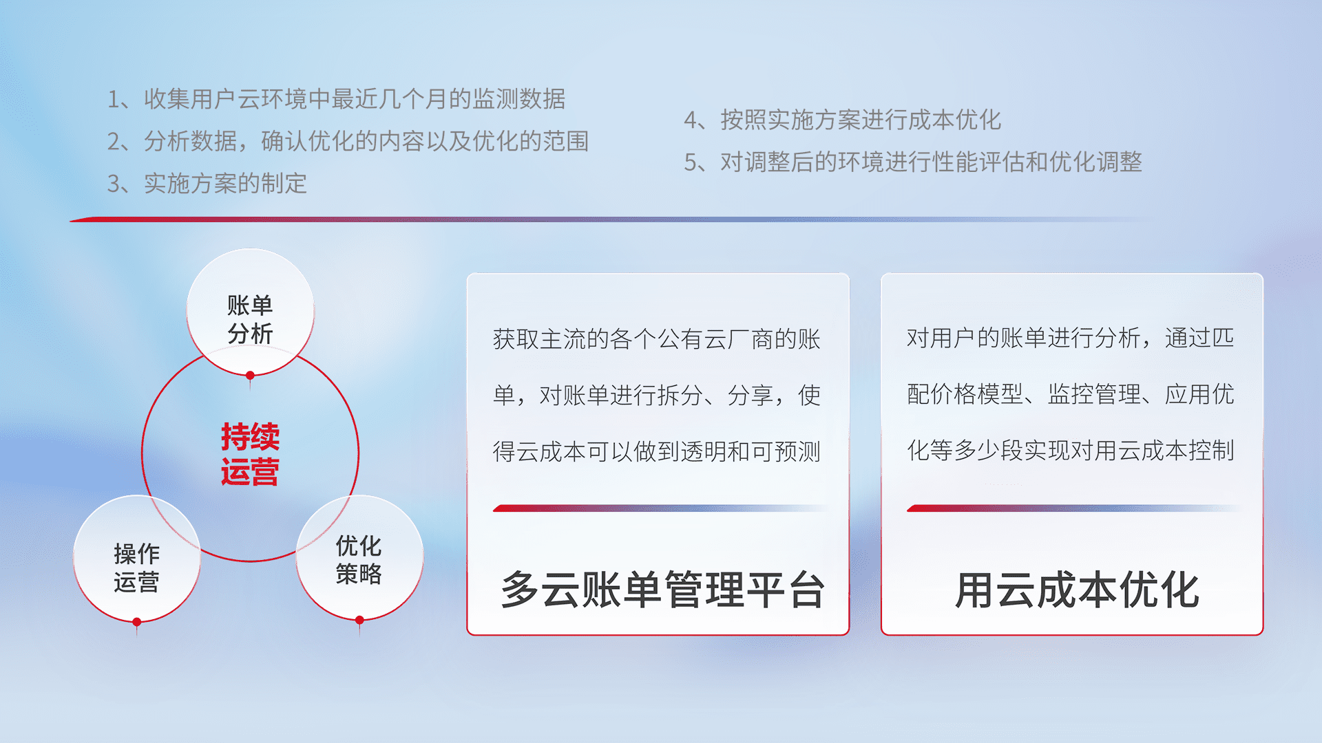 通过多云纳管,,,以统一的资源数据模型把客户的云资源进行抽象和封装,,进而实现对多云资源的统一操作,,,,保障云资源管理的可靠性、、、稳定性与可用性。。。量身定制化运维内容,,配置、、、、开发运维、、、补丁管理、、备份、、监控、、、、认证和访问管理、、、、审计和日常巡检等,,保障在用云过程中的可靠度,,,,稳定度以及高可用率。。。