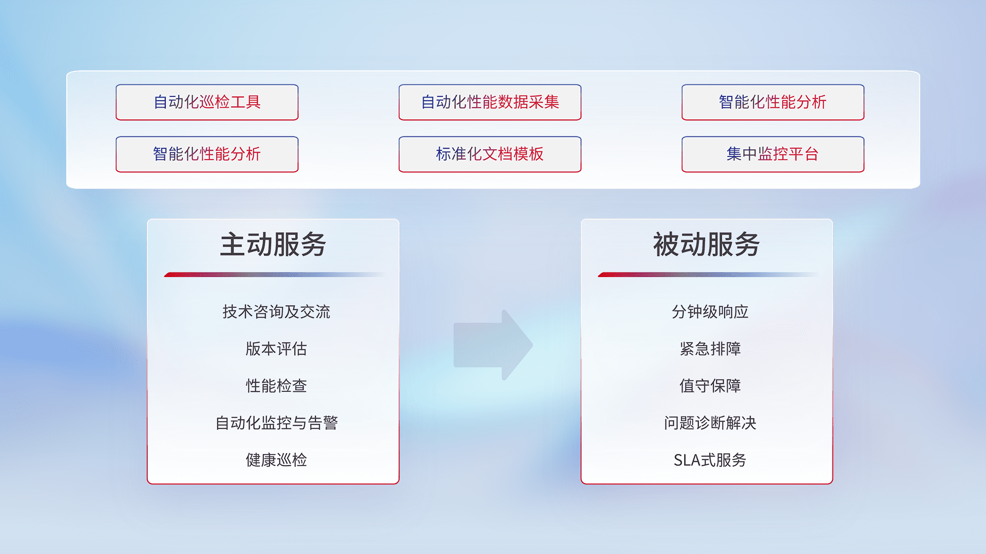 智能化工具和标准化文档,,保障服务质量,,,,提供主动服务(包含技术咨询、、版本评估、、、性能检查、、自动化监控与告警、、健康巡检)和被动服务包含(分钟级响应、、紧急排障、、、、值守保障、、、问题诊断解决、、、SLA服务)。。。